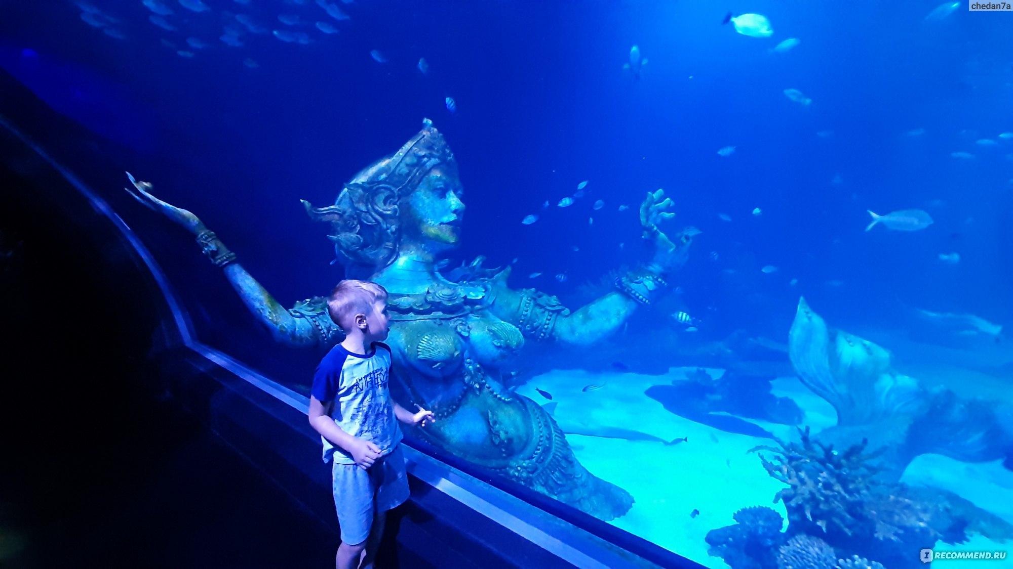 Декорации в аквариуме также очень впечатляющие на самом деле – затонувшая субмарина и морская жизнь внутри нее, это нечто). Статуя под водой в окружении разнообразных рыбок.